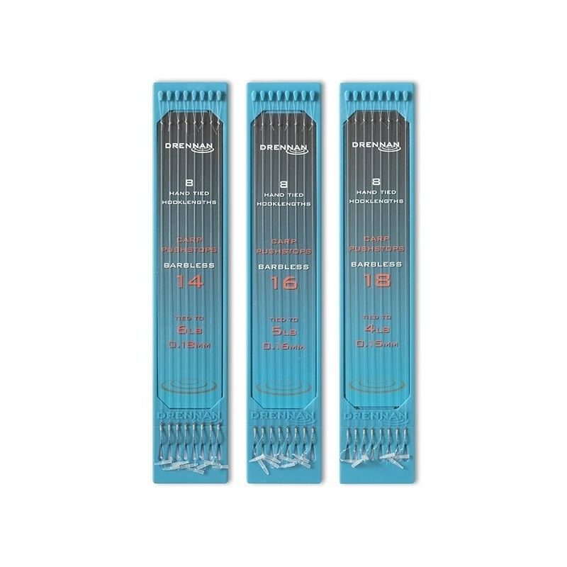 De Drennan Hookplate 6” Carp Pushstop zijn kant-en-klare vaste hengel onderlijnen met een lengte van 15cm. en speciaal ontwikkeld voor het vissen op commercials. De Carp Hair Rigger haak is bronskleurig, heeft een naar achteren gepositioneerd oog waardoor de haak recht op de lijn zit en de presentatie van het haakaas sterkt wordt verbeterd. De onderlijn is voorzien van een Pushstop welke geschikt is voor het presenteren van een pellet. De onderlijnen zijn gemonteerd op een zogenaamde “hookplate system”, dit display systeem houdt de onderlijk en lussen in één rechte lijn. Hierdoor worden kinken en beschadigingen van de nylon lijn voorkomen. Door dit systeem blijft elke onderlijn altijd om een rechte lijn onder lichte spanning opgeborgen